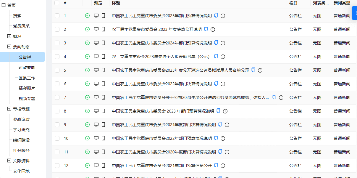 左侧为栏目,右侧为文章。